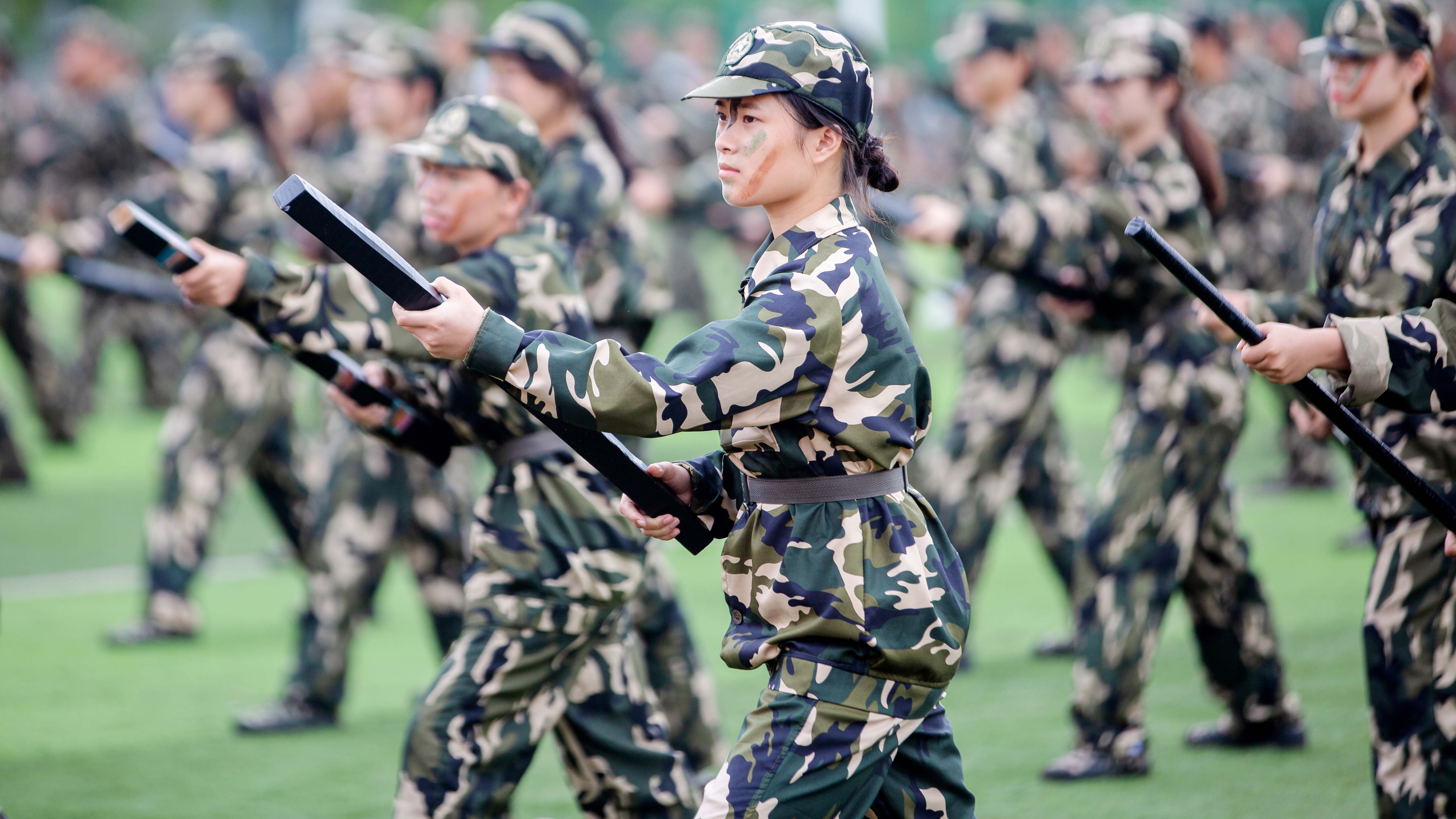 军训汇报表演将整个大会推向高潮,伴随着高亢激昂的音乐声,军训汇报表演节目《匕首操》《擒敌拳》《警棍术》《刺杀操》《战术演练》依次呈现。其中,由汽车工程学院2023级新生带来的《警棍术》让人眼前一亮,他们动作整齐,步伐铿锵有力,展现出当代大学生的青春活力。商学院带来的《刺杀操》一招一式,一令一动,赢得了阵阵掌声与喝彩。信息工程学院带来的《战术演练》尽显英雄本色,他们在漫天硝烟下一招一式,整个过程动作干净且利落,举枪、瞄准、跳跃、翻滚一气呵成。