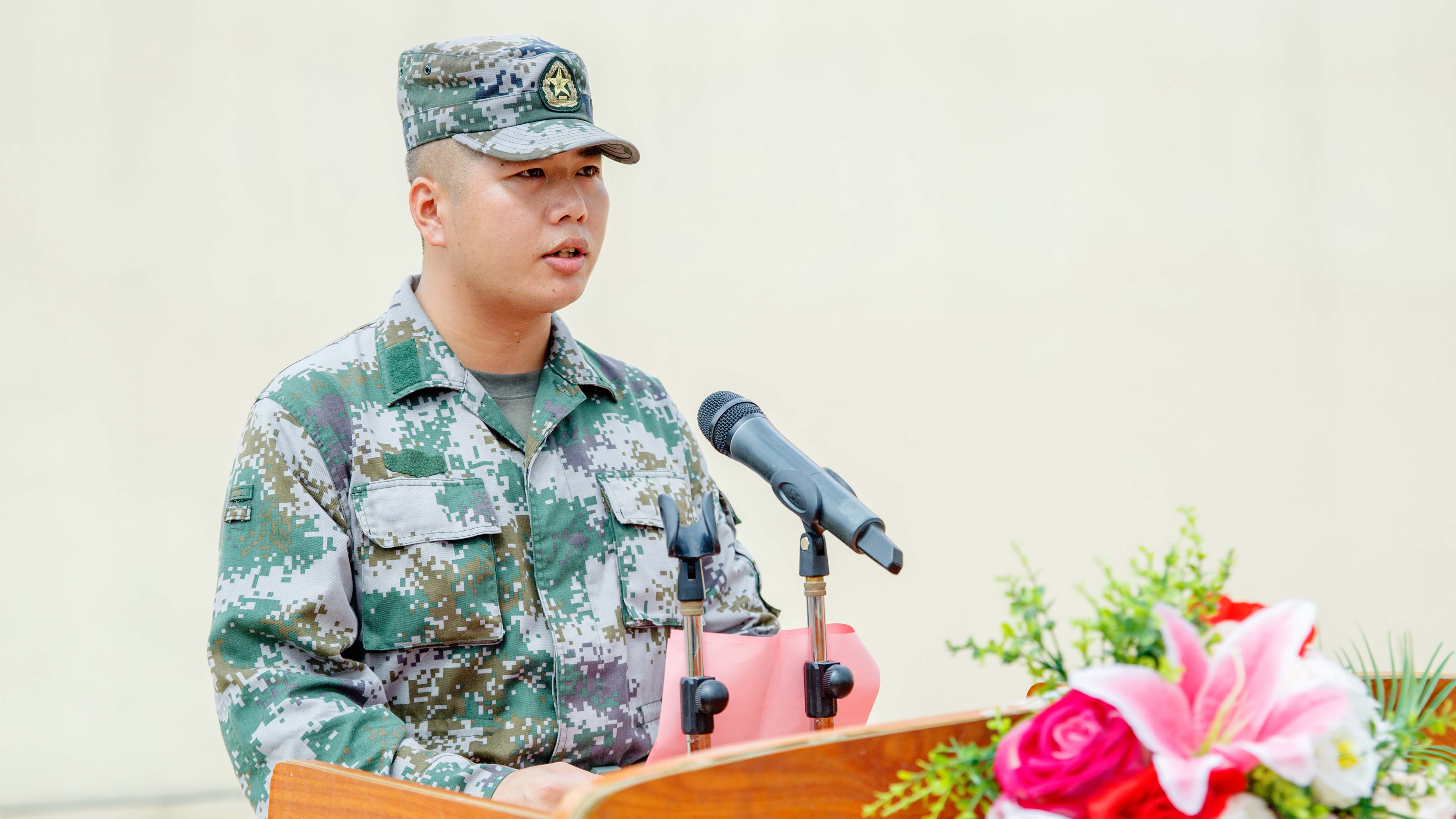 接着,崇左校区教官代表何明轩发言。他表示,只有经过“苦”的洗涤,才能铸就钢铁般的意志。军训是一个成长的阶梯,也是一个人生难忘的阶段,更是一个崭新的课堂,将来若是遇到难关或者是磨难,请同学们不要害怕,不要后退,就像在这次军训一样,勇敢去应对,去战胜。