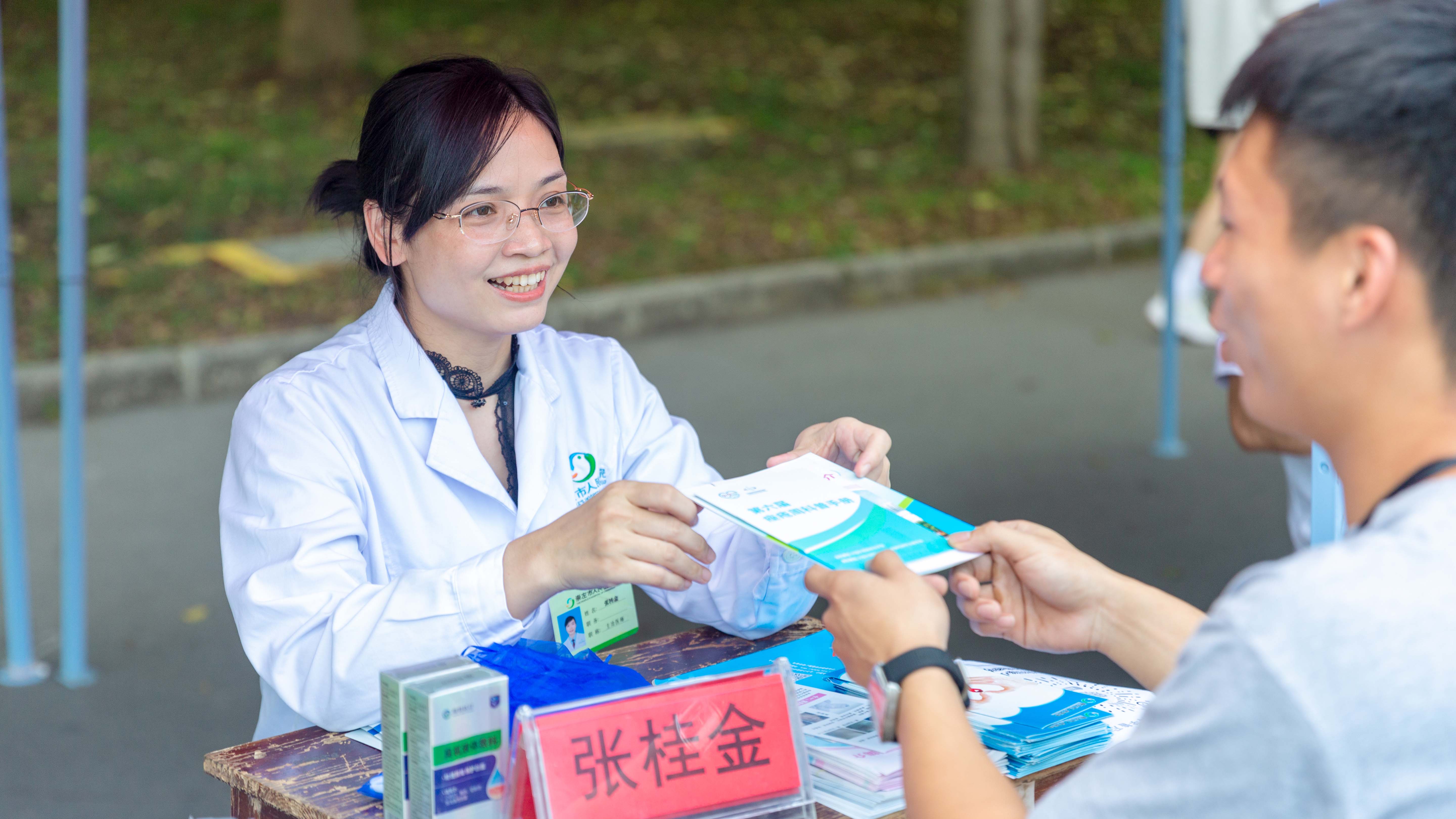 张桂金医生在给学生发宣传手册