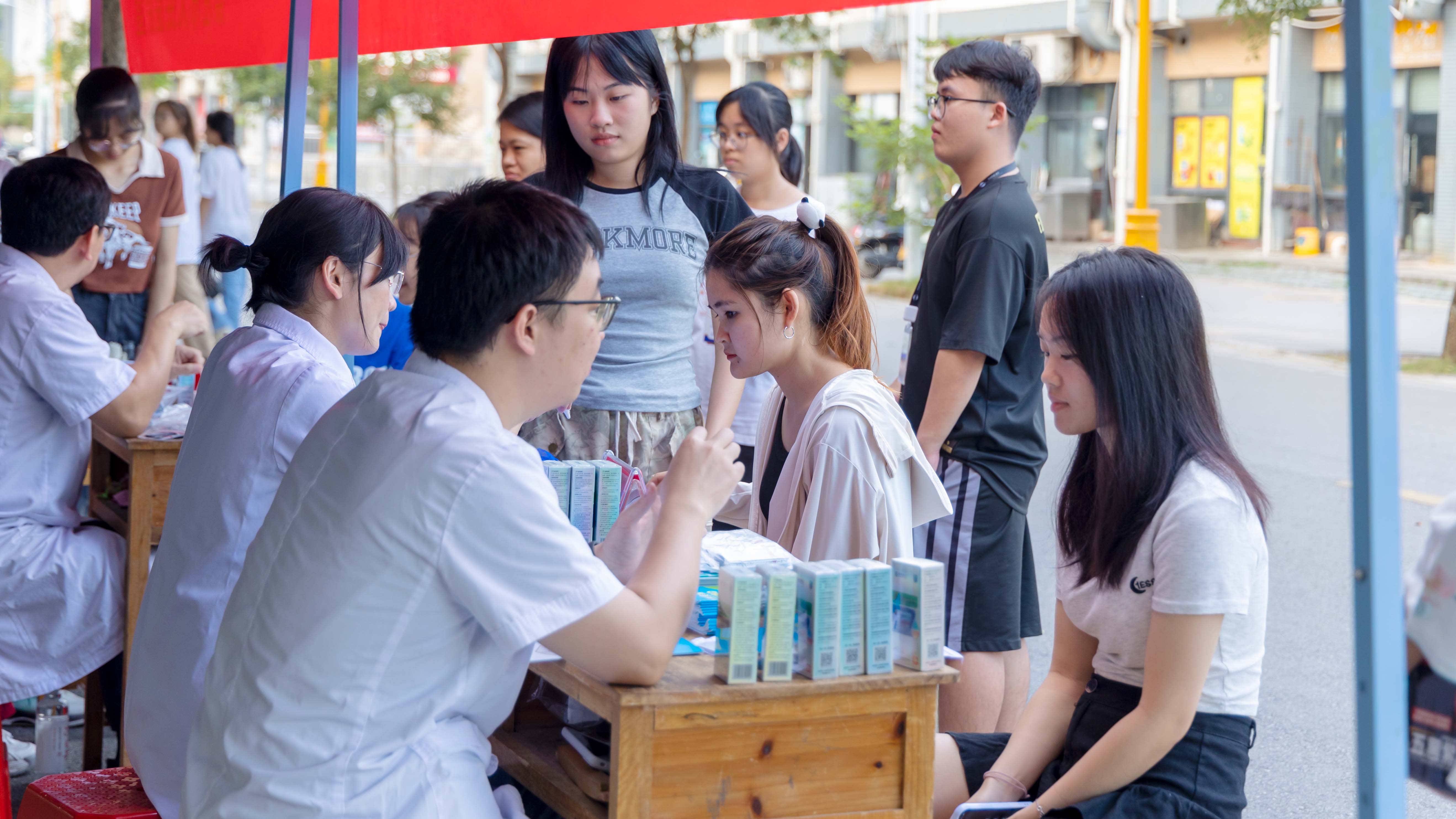 讲座结束后,医师们还在半圆广场设立宣传咨询台,耐心细致为前来咨询皮肤问题的百余名学生解答疑问,向同学们普及青少年容易出现的皮肤问题,引导他们树立健康的生活理念,养成良好的生活习惯,最后向前来咨询的同学发放皮肤健康知识宣传手册和护肤礼品。在医师的医疗服务和健康咨询中,帮助学生了解了常见皮肤问题,传递了关爱与温暖,切实提高了学生的幸福感,得到了学生的一致好评。