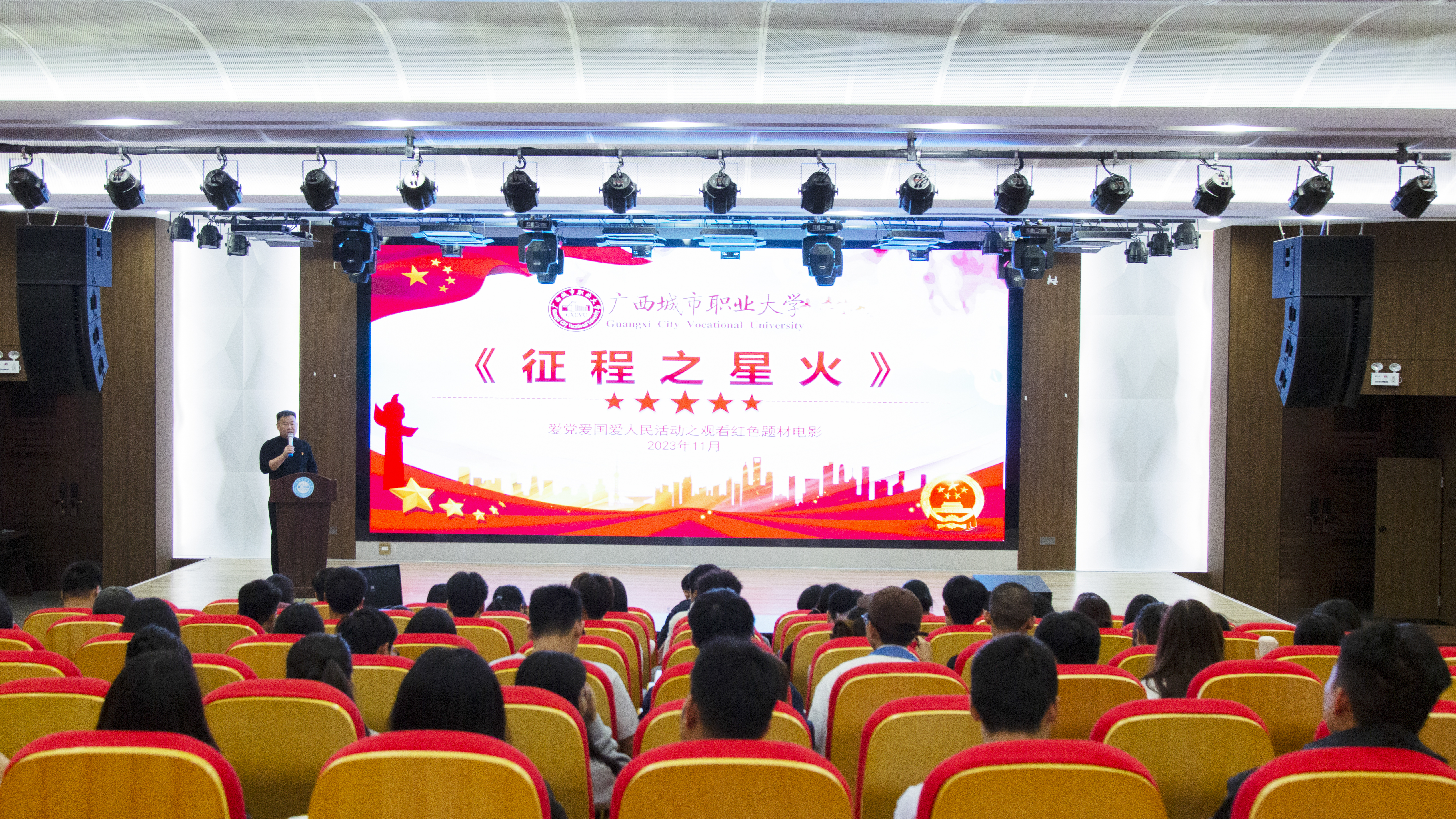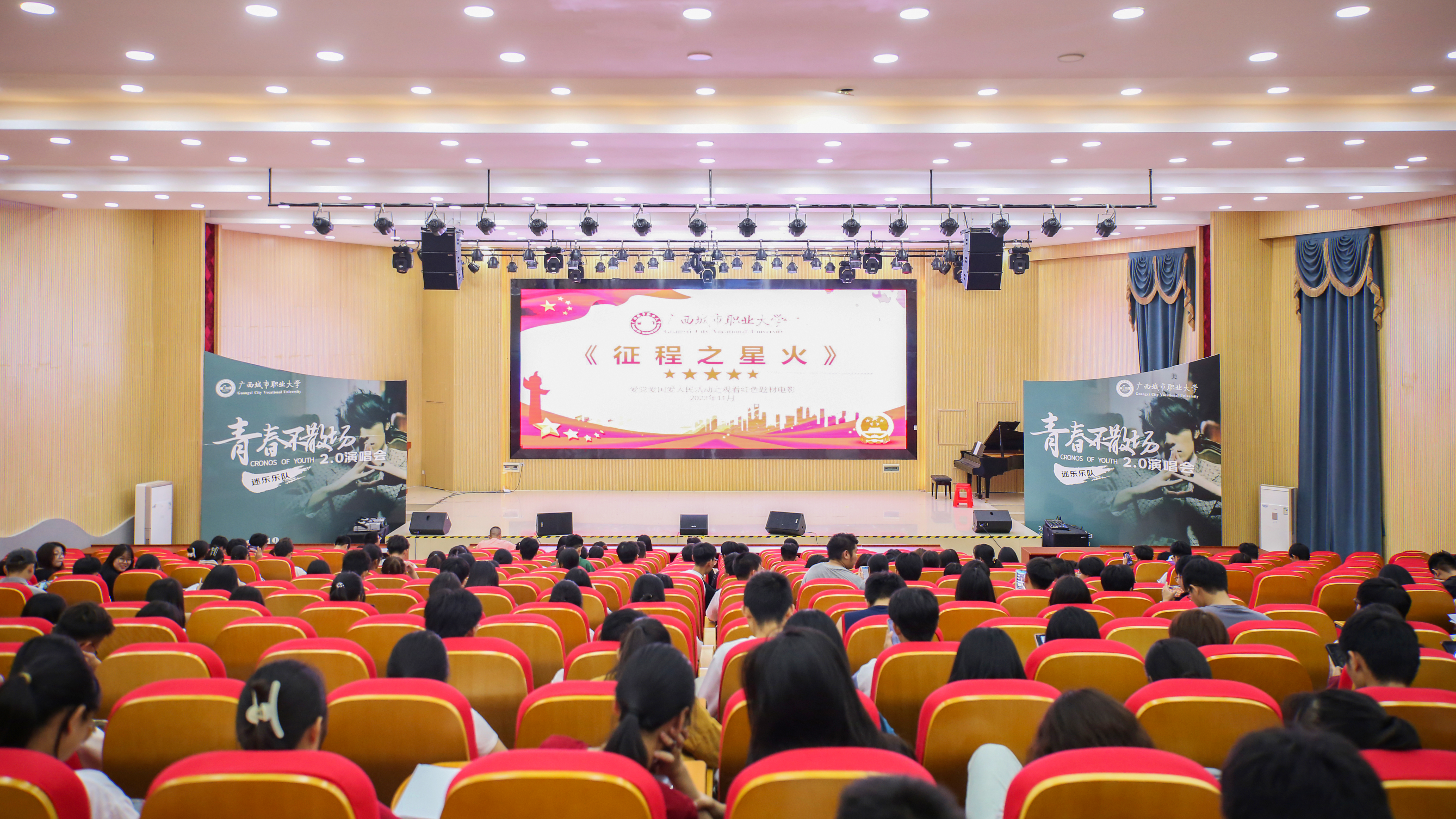 崇左校区演奏大厅内,党员同志们观看《征程之星火》影片