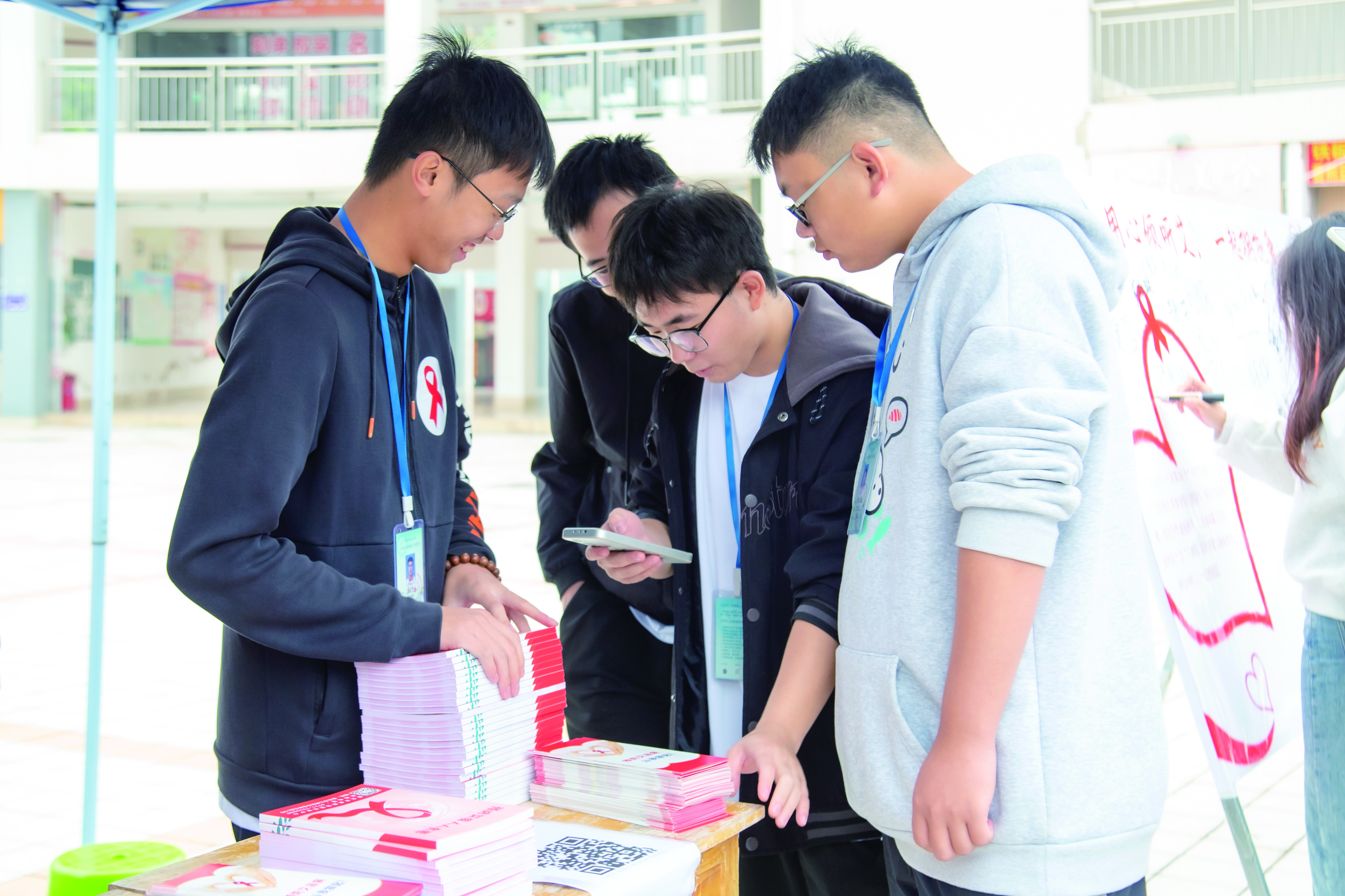 深秋将绿叶染黄,干冷的风打在脸上,道路两旁挂上了关于防治艾滋病的宣传标语,大学生心理健康委员会的成员正分发着防艾知识宣传手册、张贴扫码答题的二维码、摆放展板……