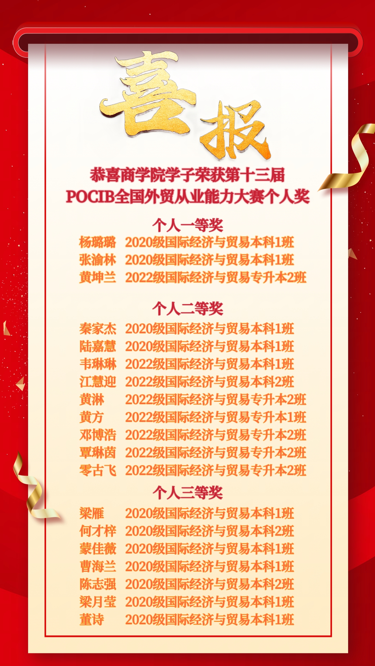 个人奖喜报
