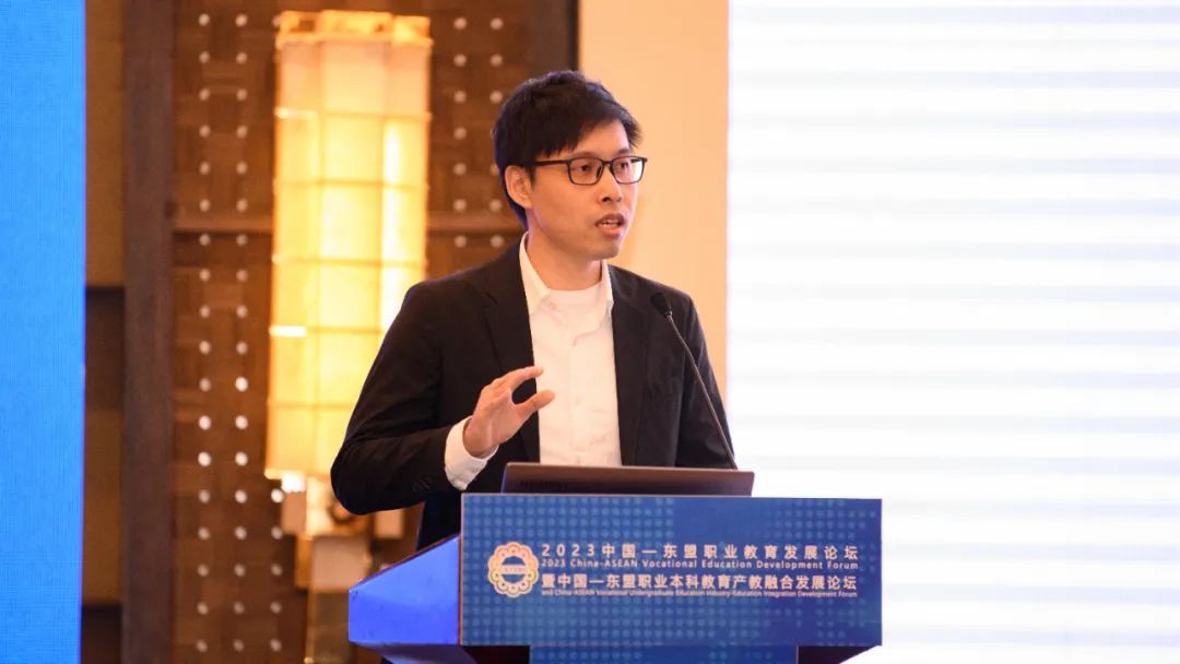 中国—东盟职业教育研究中心常务副主任王屹作《共建中国—东盟职业教育共同体,助力广西职教“出海”》为题作主旨演讲;星空(中国)官方体育网站管理学院院长唐臣以《四引四融 跃层引领——职业本科专业及专业群高质量发展实践》为题作主旨演讲;深圳职业技术学院创校校长俞仲文以《从工业工匠到数智工匠——为职业本科教育加快数字化转型建言》为题作主题演讲;马来西亚汝来大学副校长邱德荣(Khoo Teck Yong)以《马来西亚高等教育机构在东盟职业教育产出方面的现状与建议——以汝来大学为例研究》为题作主题演讲;广东工商职业技术大学副校长方泽强以《职业本科高校高质量发展的实践思考》为题作主题演讲;广西汽车集团首席技能专家、全国技术能手郑志明以《聚焦产教融合 携手创新发展》为题作主题演讲;海南科技职业大学副校长刘成有以《深化产教融合 赋能职业教育高质量发展》为题作主题演讲;泰国易三仓大学亚洲创新学院院长谢宗顺以《东盟国家职业教育与职业幸福感发展趋势——以泰国为例》为题作主题演讲。