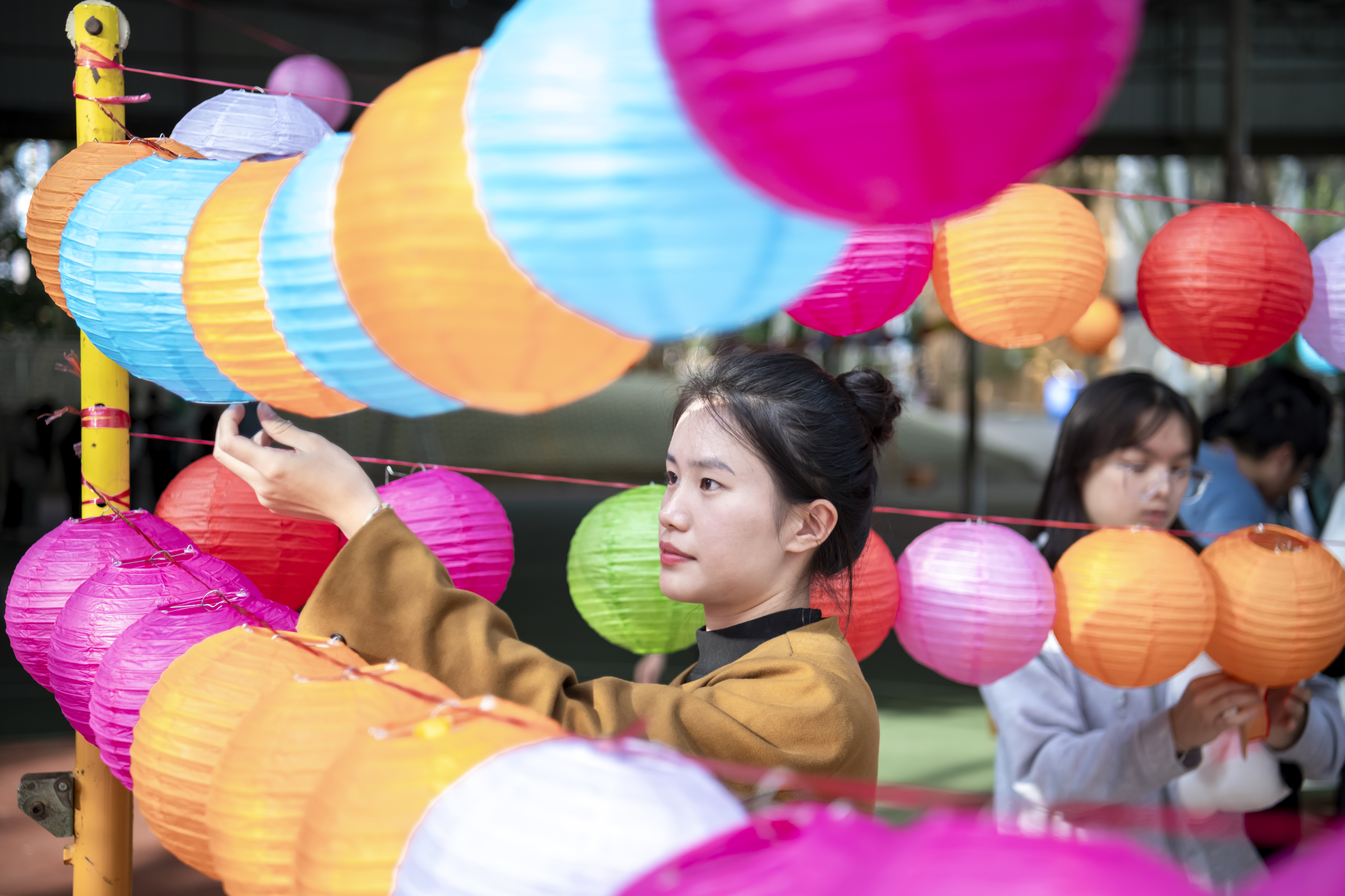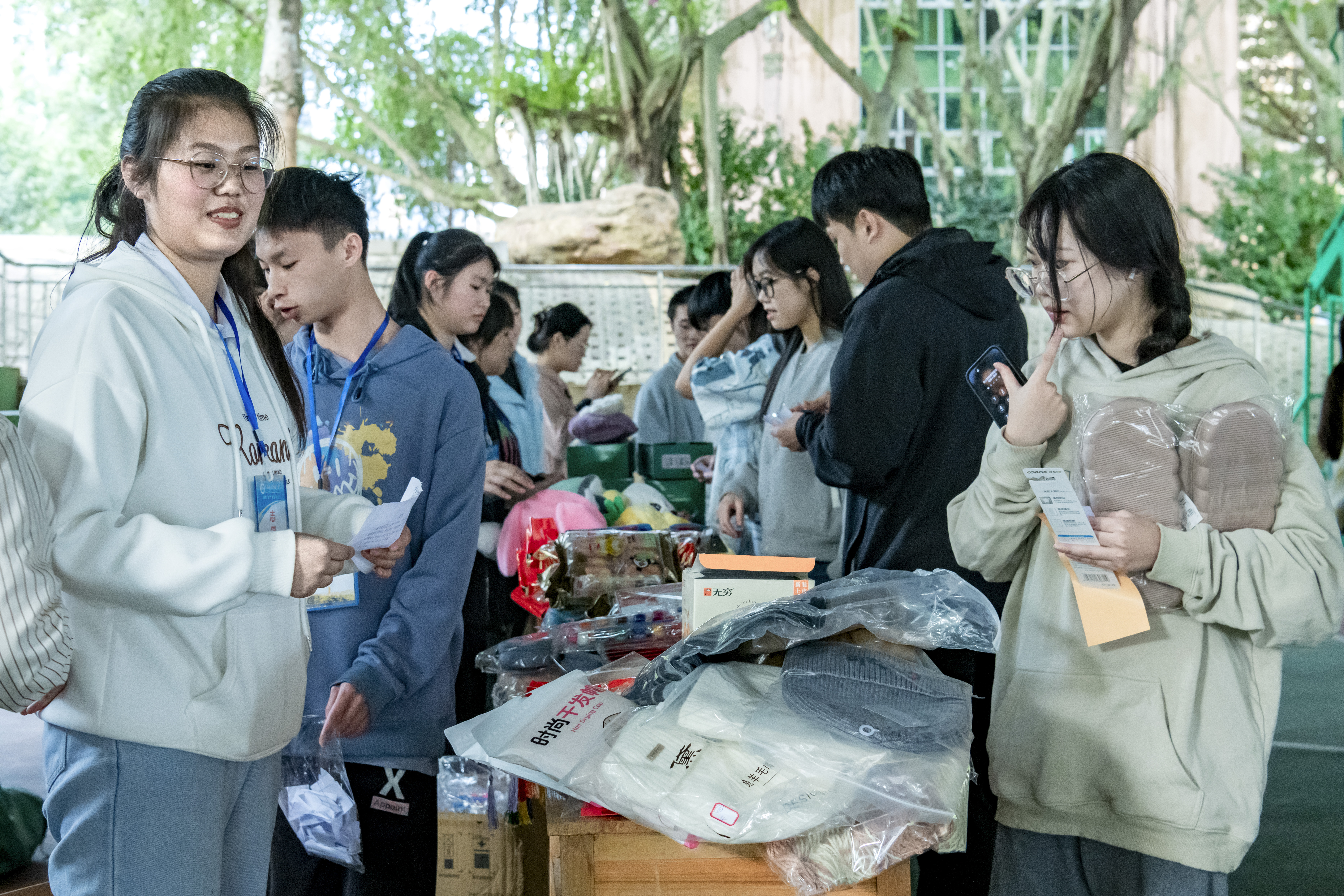 同学们在现场有序排队参加各项游戏,在游戏过程中增进彼此的友谊,在欢声笑语中舒缓身心,拿着自己赢来的奖品满载而归。