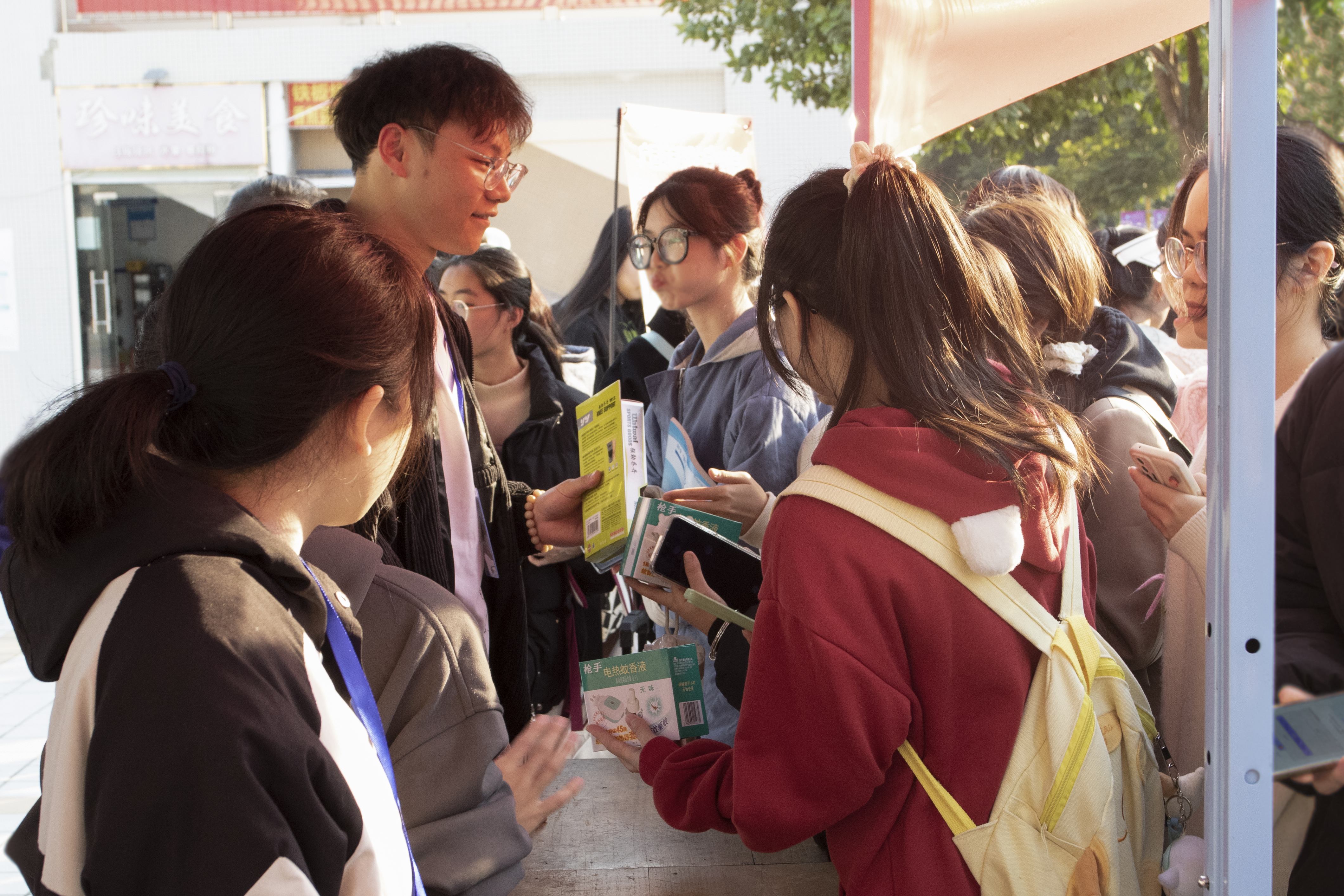 工作人员给答题的同学们分发礼品