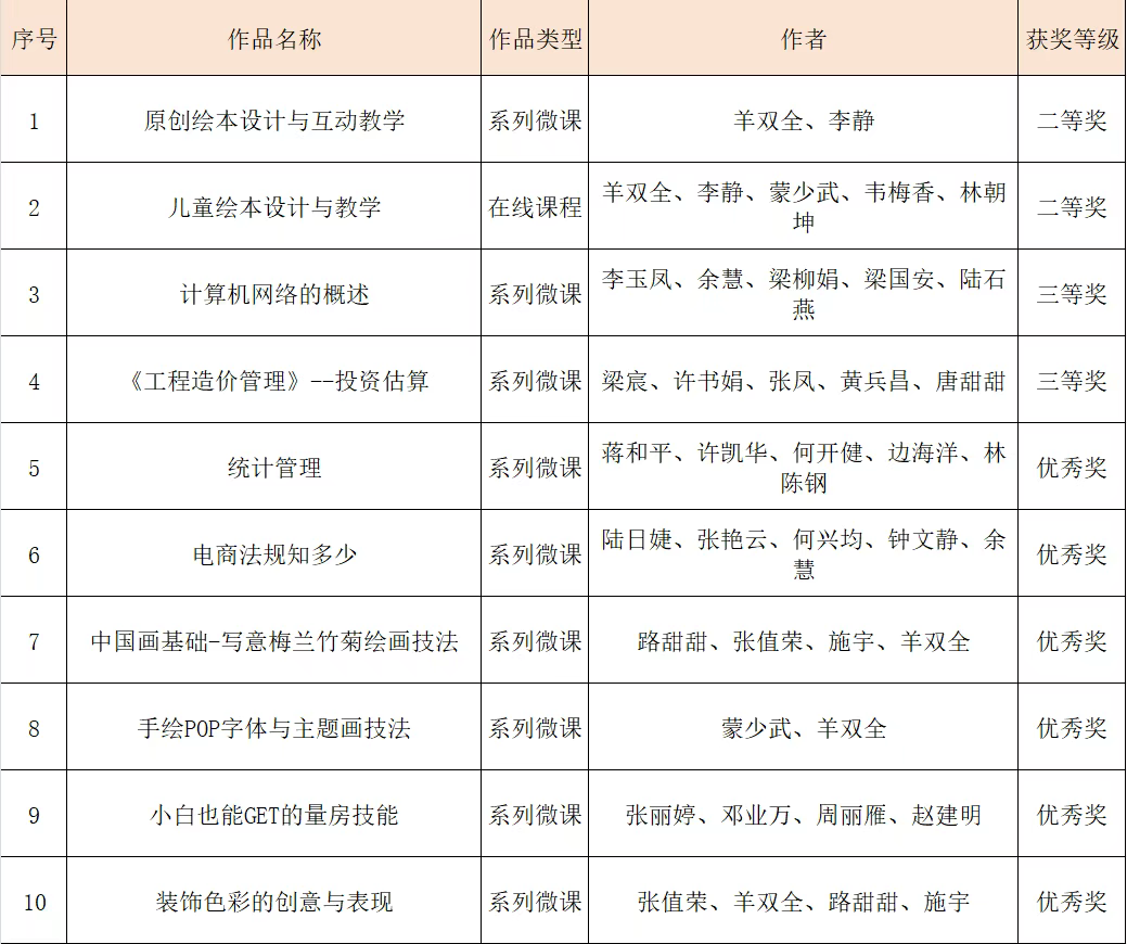 我校教师团队积极备赛,经过紧张激烈的角逐,我校羊双全教师团队的作品《原创绘本设计与互动教学》荣获系列微课组二等奖、《儿童绘本设计与教学》荣获在线课程组二等奖;李玉凤教师团队作品《计算机网络的概述》、梁宸教师团队作品《工程造价管理》——投资估算荣获系列微课组三等奖,《统计管理》等六件作品荣获优秀奖。