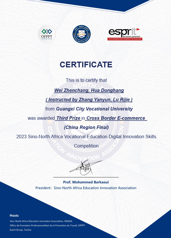 为培养跨境电子商务应用型人才,积极探索跨境电商新业态下的国际标准、职业标准与专业教学标准的深度融合,近期,从中北非国际创新联盟处传来佳讯,我校商学院代表队在2023首届中北非国际职业教育数字化创新技能竞赛中斩获中国赛区决赛三等奖。