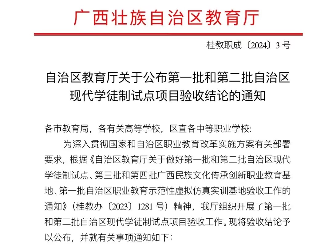 近日,根据《自治区教育厅关于公布第一批和第二批自治区现代学徒制试点项目验收结论的通知》(桂教职成〔2024〕3号),我校工业机器人技术专业作为现代学徒制试点项目顺利通过自治区教育厅验收。