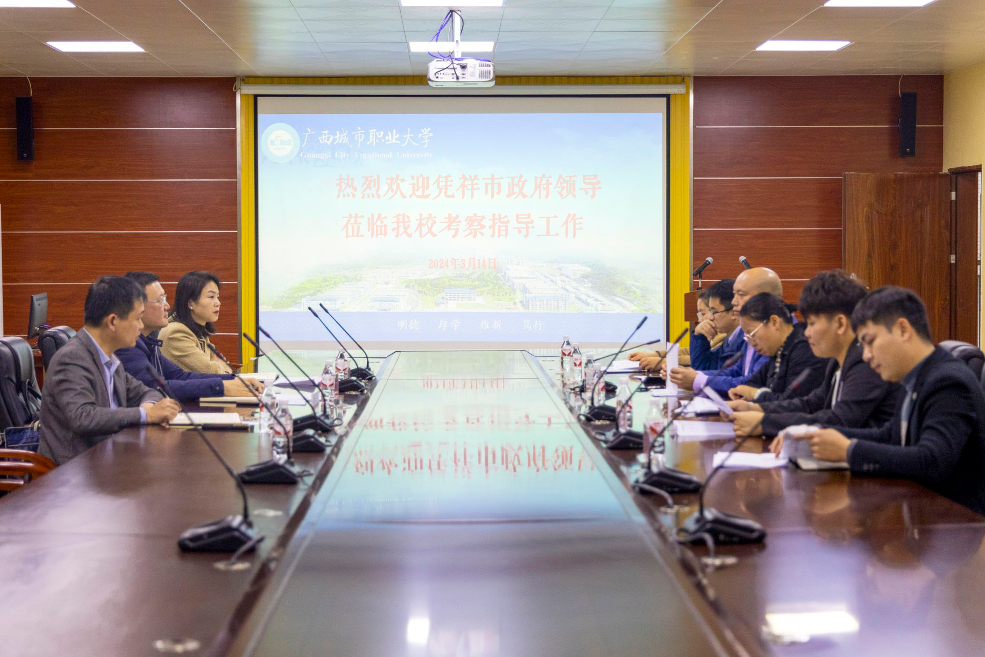 为做好崇左市“留人计划”相关工作,让毕业生了解凭祥、认识凭祥、留在凭祥、建设凭祥,3月14日下午,凭祥市委常委、常务副市长黄荣荣带队到我校调研交流高校毕业生就业见习有关工作,我校就业创业指导中心副主任张钦锋、学工部(处)副处长柳成英及各学院领导代表出席会议。