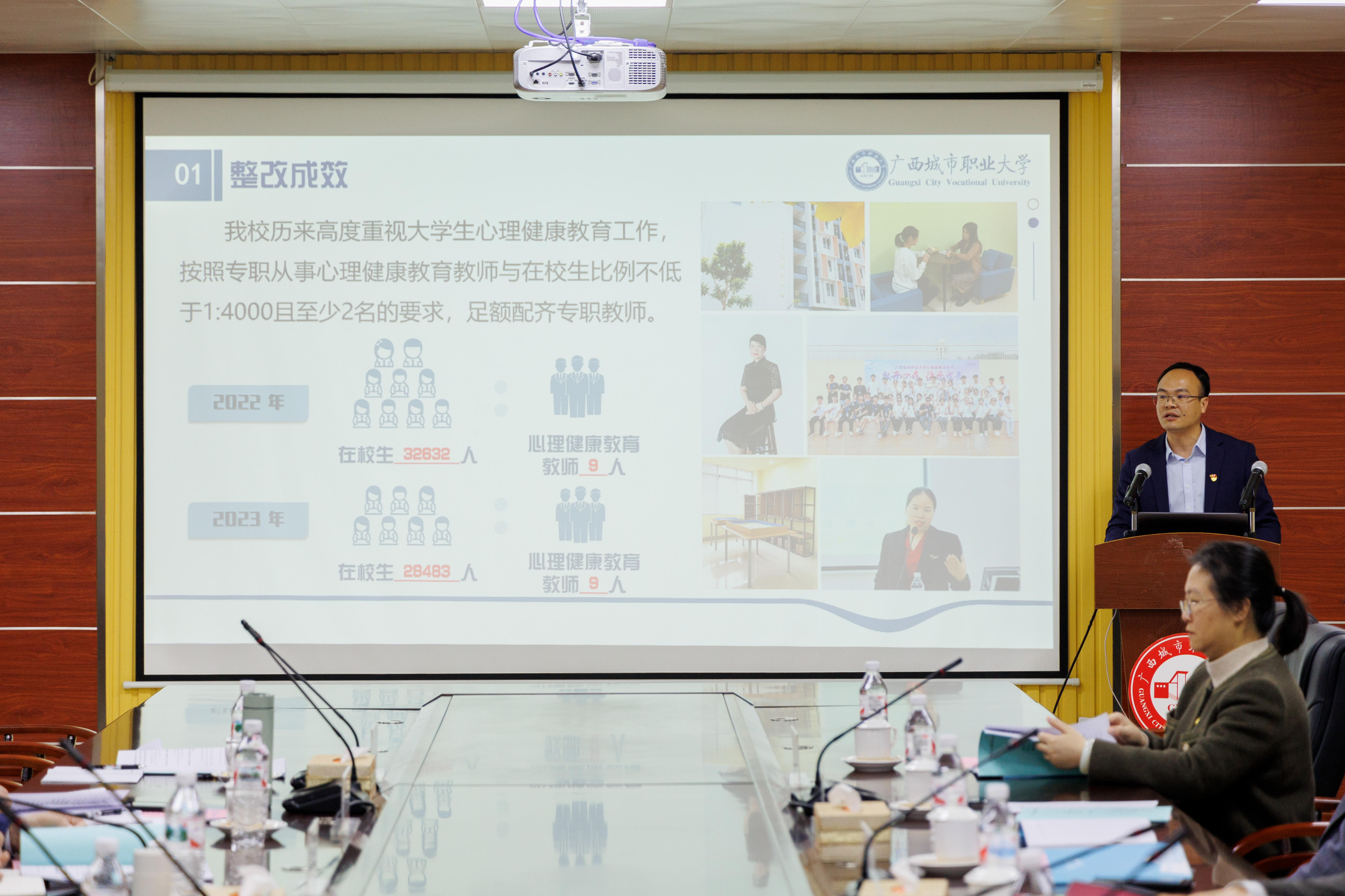 梁华廉副校长作学校年检工作情况汇报。他从整改成效、工作成绩与亮点、改进及展望三个方面进行了详细汇报,并表示在各级政府和部门的支持与帮助下,我们将严格按相关标准和要求,真正把星空(中国)官方体育网站办成为地方经济社会发展服务,在广西乃至全国有一定影响力的大学,不辜负党和国家赋予的重任和寄予的期望。