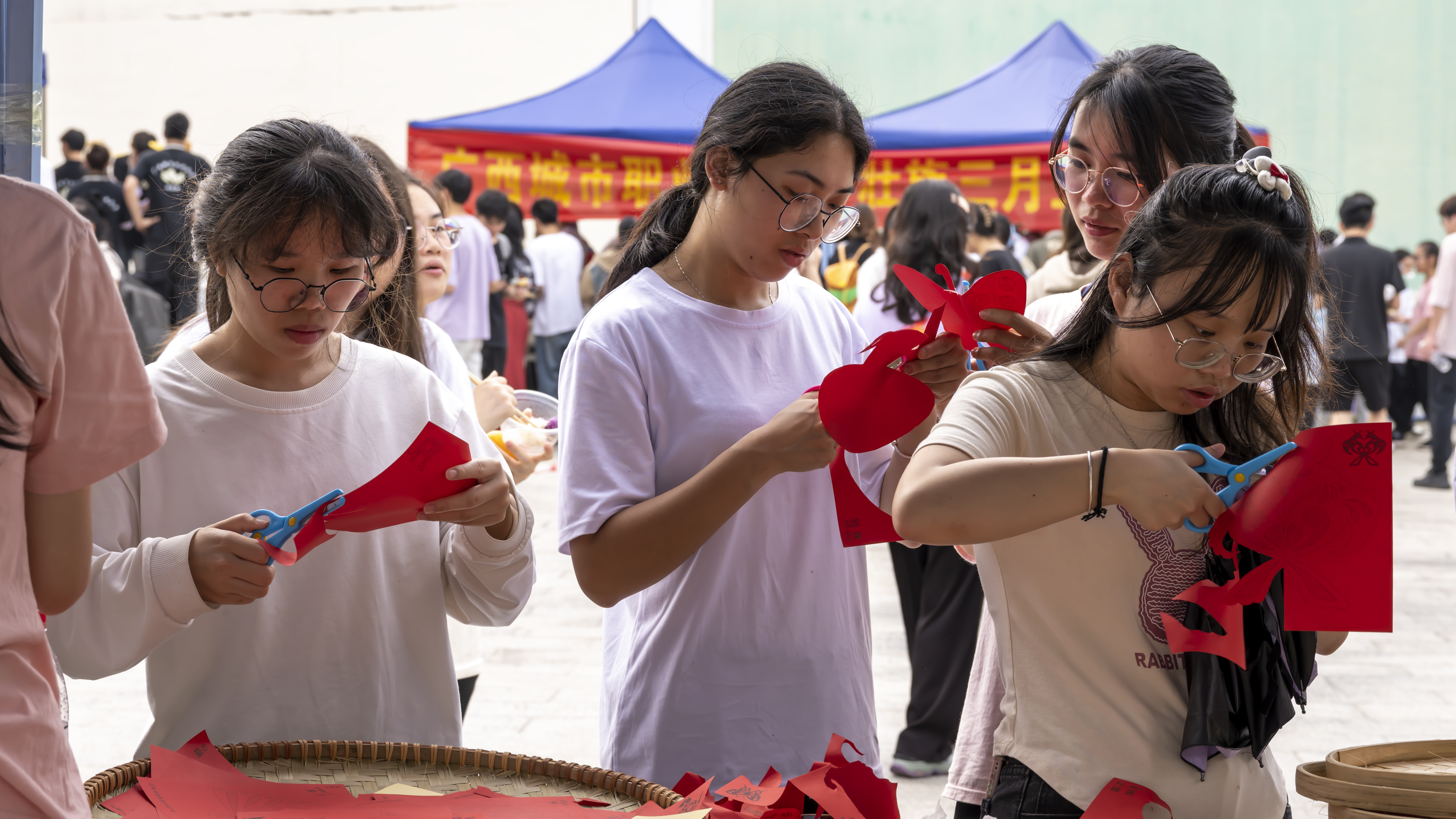 在美食活动比赛中,师生们发挥创意,制作了五色糯米饭创意拼盘和柠檬鸭等非遗美食。现场观众品尝后纷纷投票,评选出最受欢迎的作品。此外,传统手工艺体验区域也备受青睐,学生们通过制作壮族挂画、纽扣粘贴画等民族特色手工艺品,锻炼了动手实践能力,加深了对民族文化的热爱。