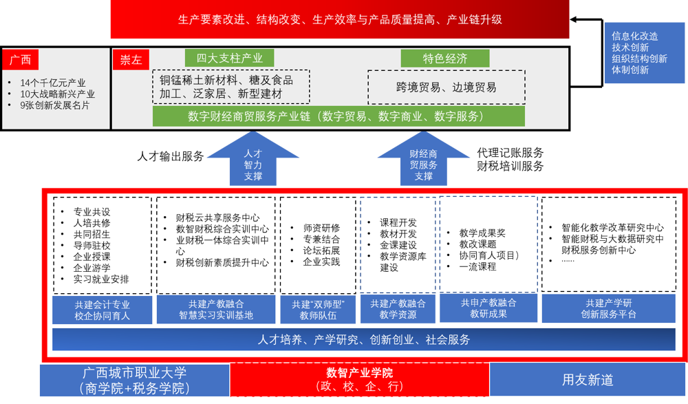 以广西“14+10”、“九张创新发展名片” 和崇左铜锰稀土新材料、糖及食品加工、泛家居、新型建材四大支柱产业、跨境边贸特色经济数字化升级发展需求为导向,按照崇左市十四五规划、《现代产业学院建设指南(试行)》《广西壮族自治区高等职业院校产业学院建设的指导意见(征求意见稿)》《广西壮族自治区高等职业院校示范性产业学院建设指标体系(征求意见稿)》等政策文件指引,以1+X证书制度试点为抓手,以会计专业共建校企协同育人为主线,以产教融合智慧实习实训基地建设为载体,聚焦产业数字化融合升级等重点发展领域,持续深化产教融合,探索学校、企业机构、行业协会、地方政府联动共建一个集人才培养、产学研究、创新创业和社会服务于一体的数智财税产业学院,培养一批高素质、创新型、应用型、复合型财务会计类技术技能人才,打造面向崇左市四大支柱产业集群、跨境边贸特色经济体、数字财经商贸服务产业链的产学研合作平台和服务创新中心,成为推动我校服务崇左产业升级的服务创新转化平台和人才培养高地,力争到2023年,建设成为自治区级示范性产业学院。