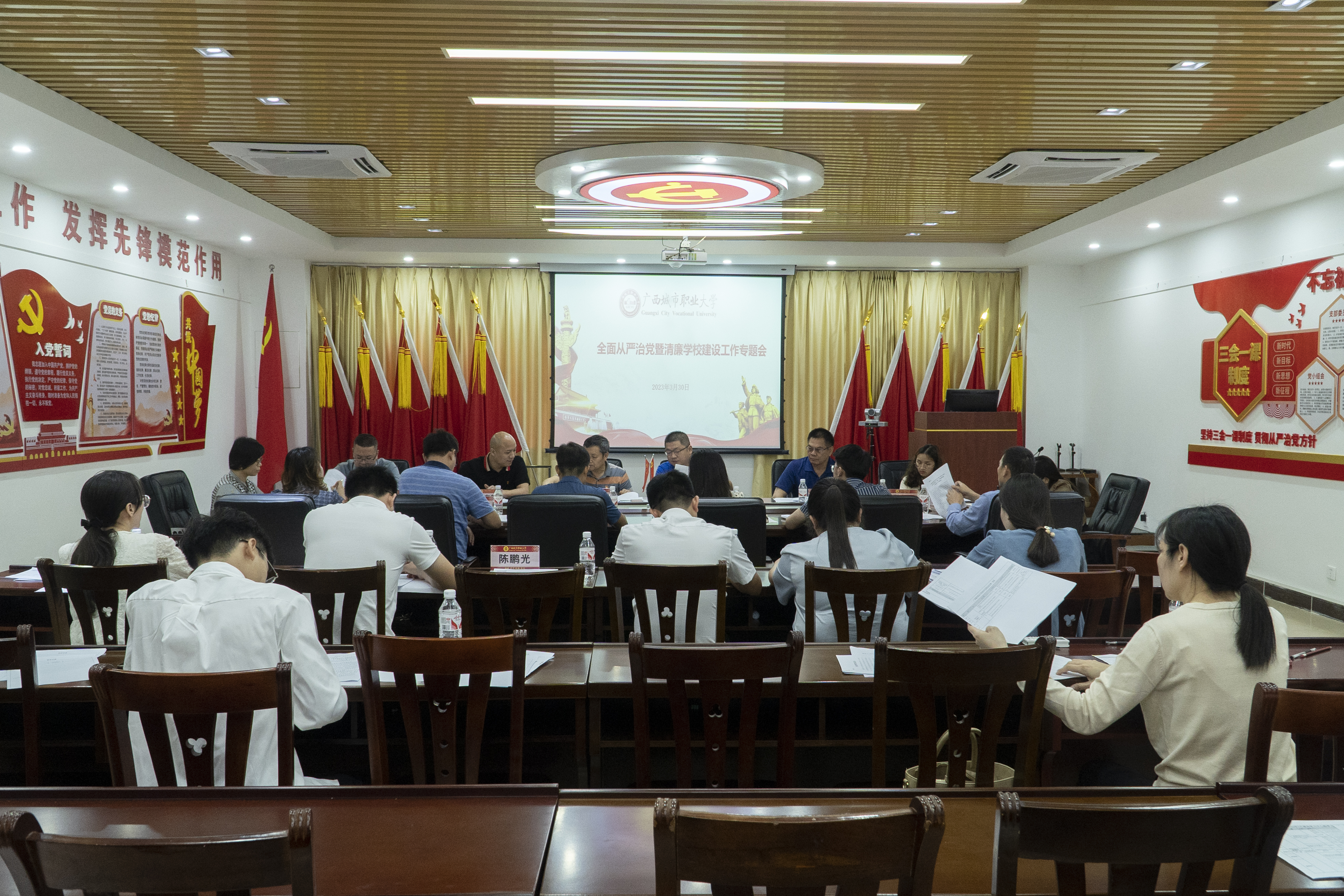 3月30日,学校党委在尚美楼三楼党员活动室开展全面从严治党暨清廉学校建设工作会议,会议集中学习了清廉广西建设领导小组会议讲话精神以及传达、学习崇教工〔2023〕8号文件精神,并布置酒驾醉驾等专项治理工作。党委书记伍鹏志,党委委员,各学院、部门负责人出席会议。党委副书记、纪委书记习尧青主持会议。