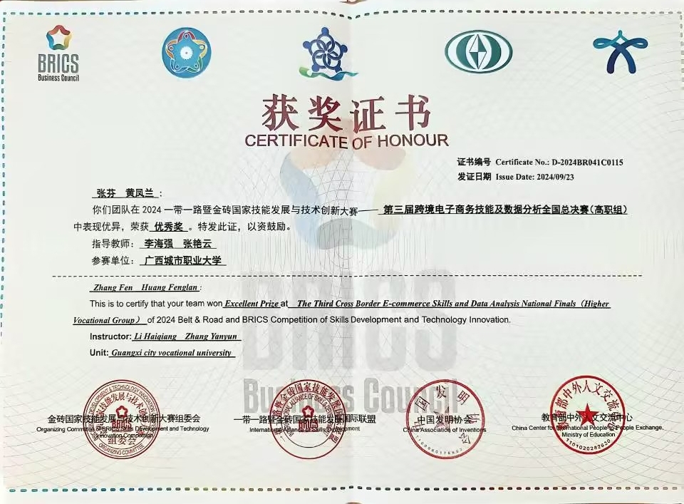 在大赛的第三届跨境电子商务技能及数据分析赛项中,商学院学子张芬、黄凤兰组成的团队在全国复赛(高职组)中荣获团体一等奖,并在全国决赛(高职组)中荣获优秀奖。指导教师为李海强、张艳云。