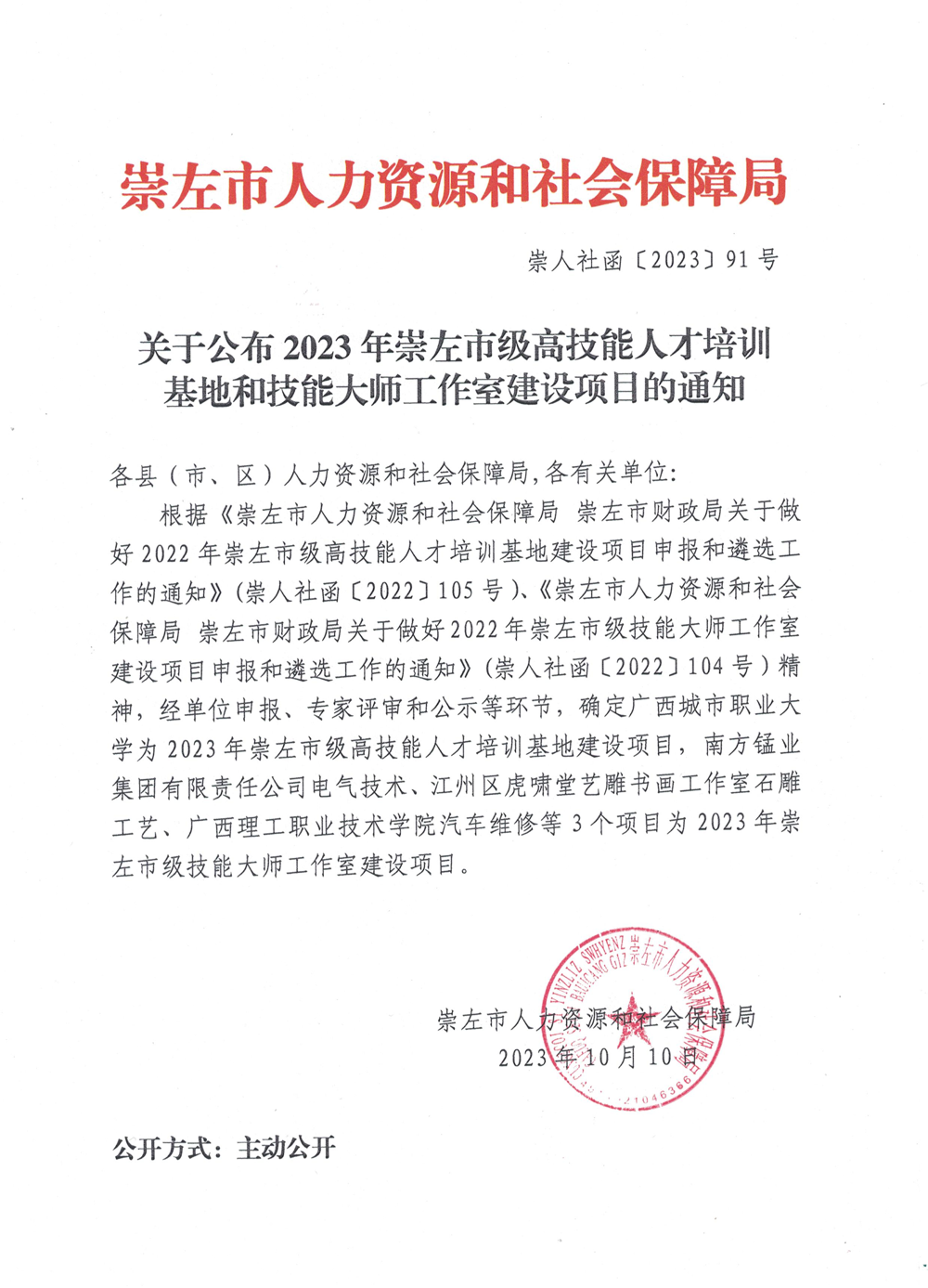 关于公布2023年崇左市级高技能人才培训基地和技能大师工作室建设项目的通知