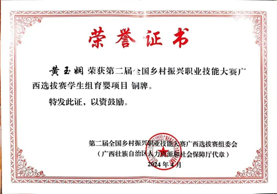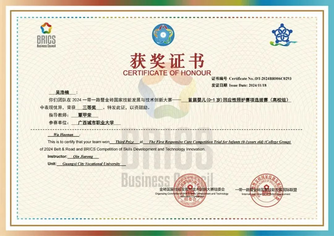 为了展示学生的学习成果和职业技能水平,我校通过课赛融通教学模式,组织学生积极参加各项技能竞赛。2023年,参加了“一带一路”暨金砖国家技能发展与技术创新大赛首届婴幼儿照护职业技能赛项,2023级婴幼儿托育服务与管理专业的学生荣获高校组三等奖和优秀奖。2024年,参加第二届全国乡村振兴职业技能大赛广西选拔赛育婴员学生组,获得铜奖;参加2024年中国一东盟职业院校婴幼儿照护服务技能竞赛中荣获三等奖。