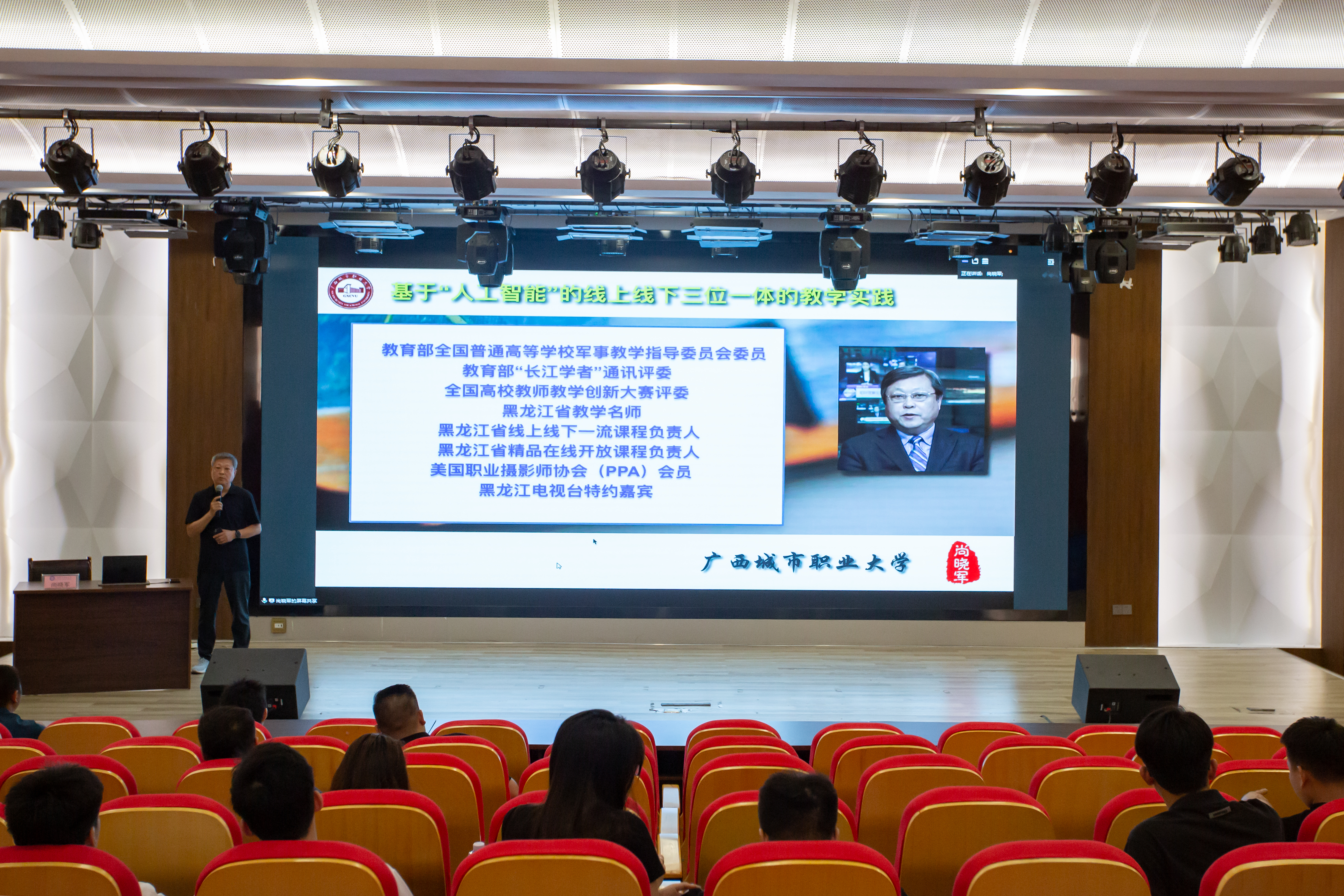 尚晓军教授是我校引进的黑龙江大学银龄教师,是教育部全国普通高等学校军事教学指导委员会委员、教育部“长江学者"通讯评委、全国高校教师教学创新大赛评委、黑龙江省教学名师、黑龙江省线上线下一-流课程负责人黑龙江省精品在线开放课程负责人,他在人工智能与线上线下教师实践方面有着非常丰富且专业的研究。